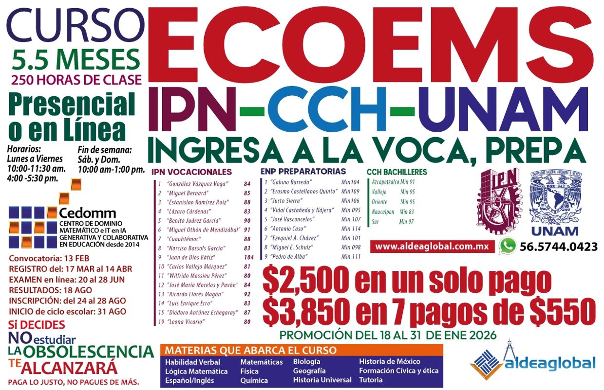 Curso ECOEMS: Ingresa a la escuela de tu preferencia IPN (Cecyt) o UNAM (Prepa o CCH).